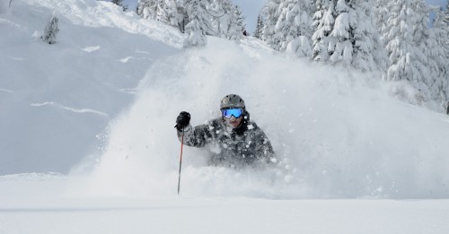 Winter 2017 keeps on delivering! A skier at Mt. Hood Meadows blasts through the light powder. Image…
