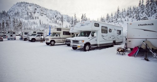 Slopeside camping is popular at ski areas across the Northwest. Campers line up at Hoodoo Ski Area….